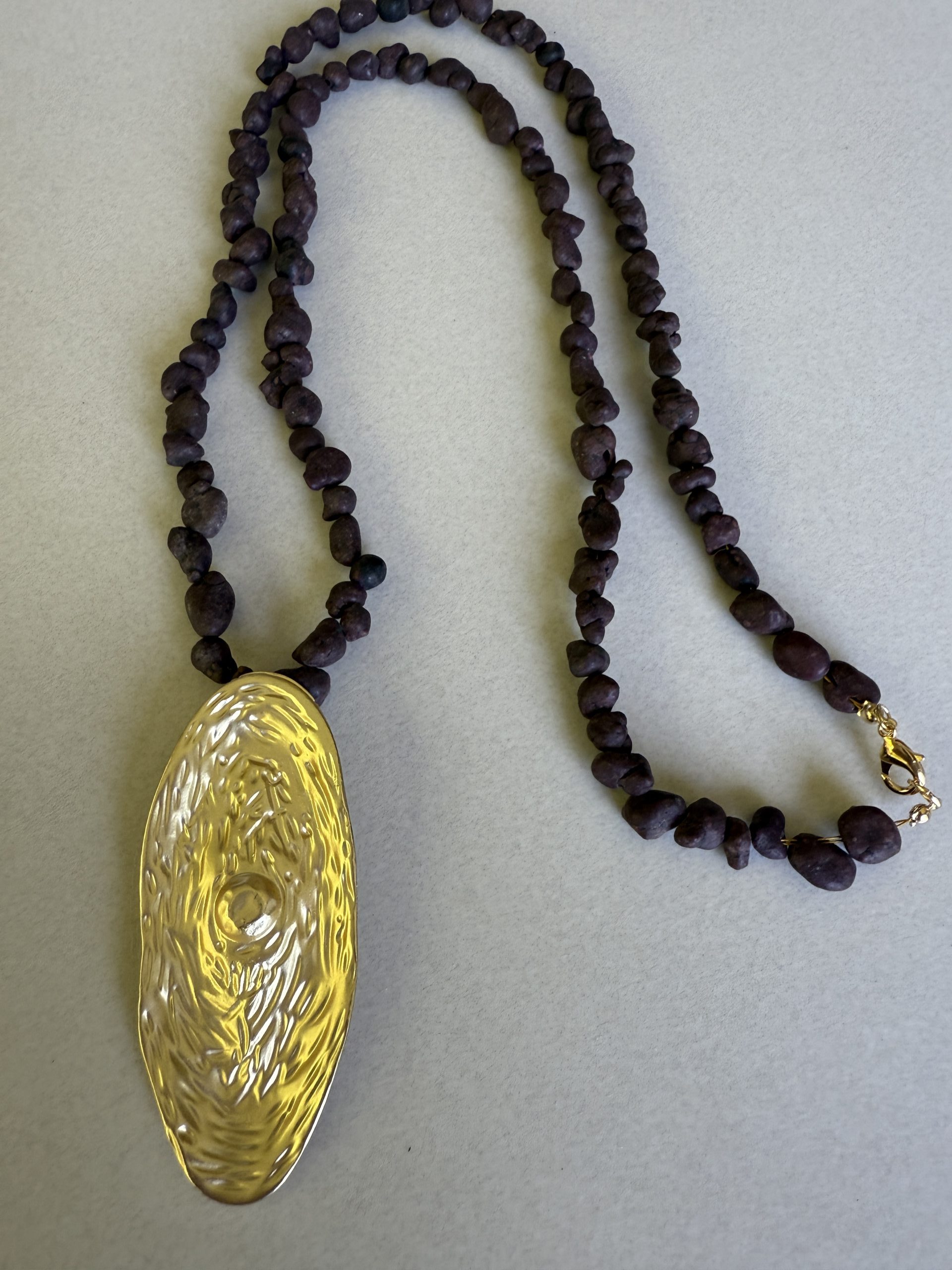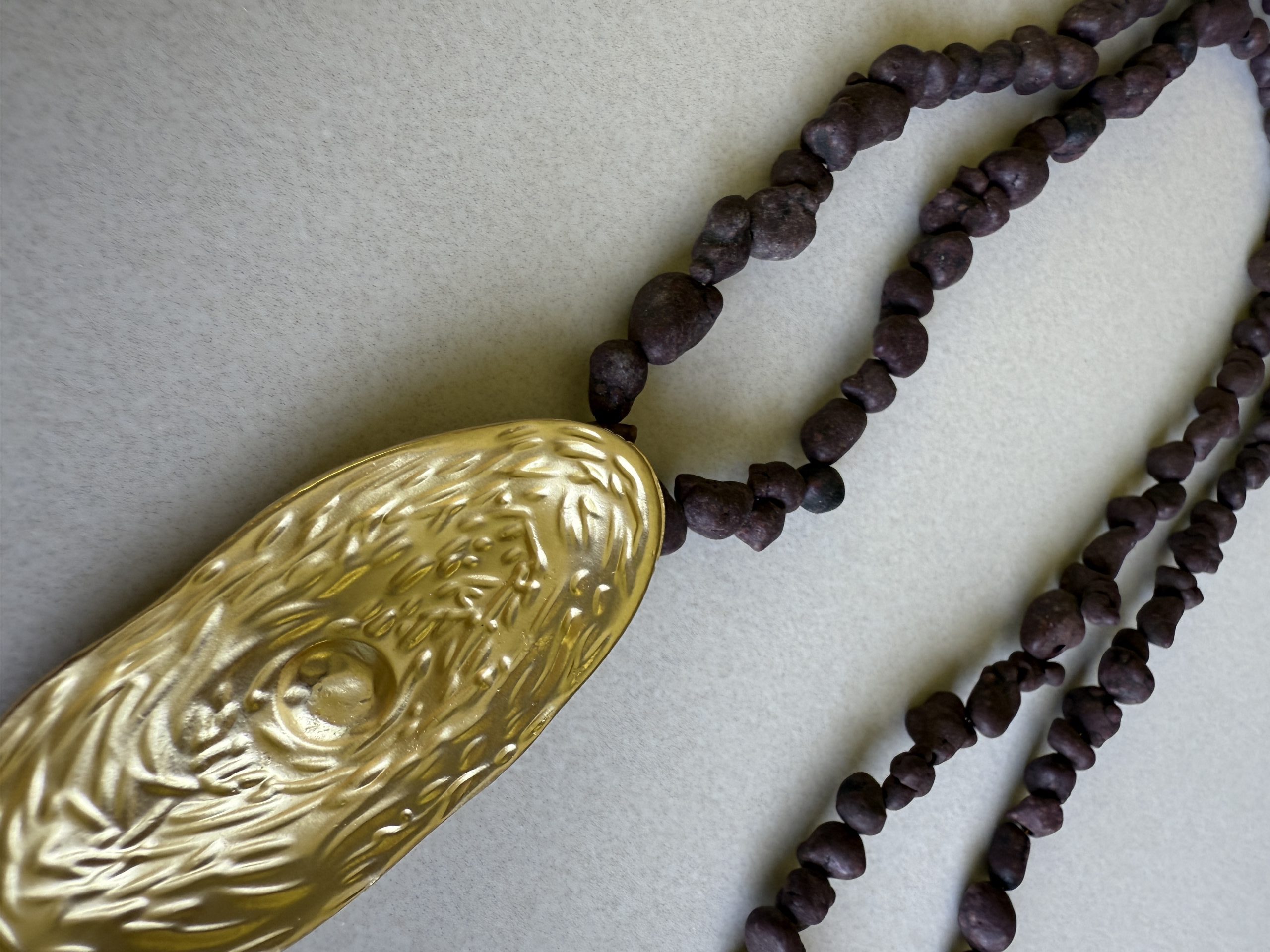 COLLAR LARGO MEDIDAS 90 CMS., CON COLGANTE BAÑADO EN ORO OPACO ,MEDIDAS COLGANTE LARGO 9 CMS. Y ANCHO DE 4 CMS.TERMINACIONES CON BAÑO DE ORO.