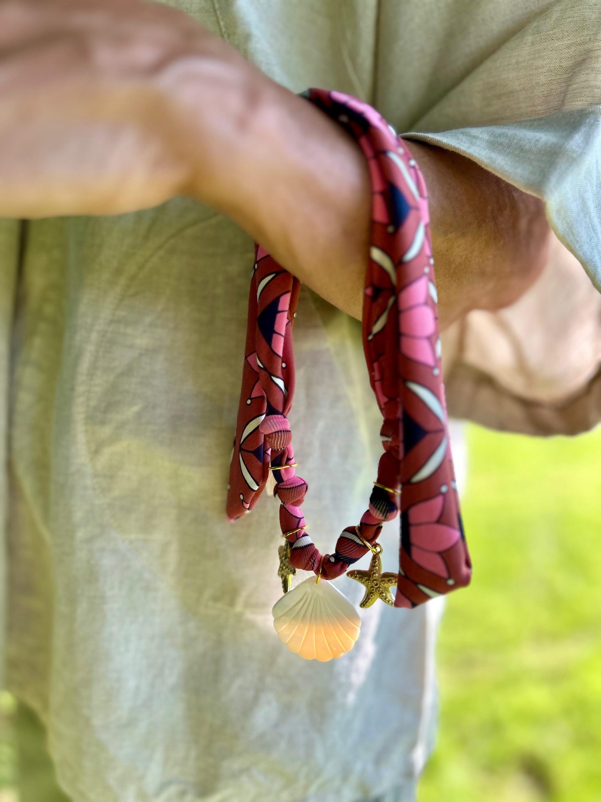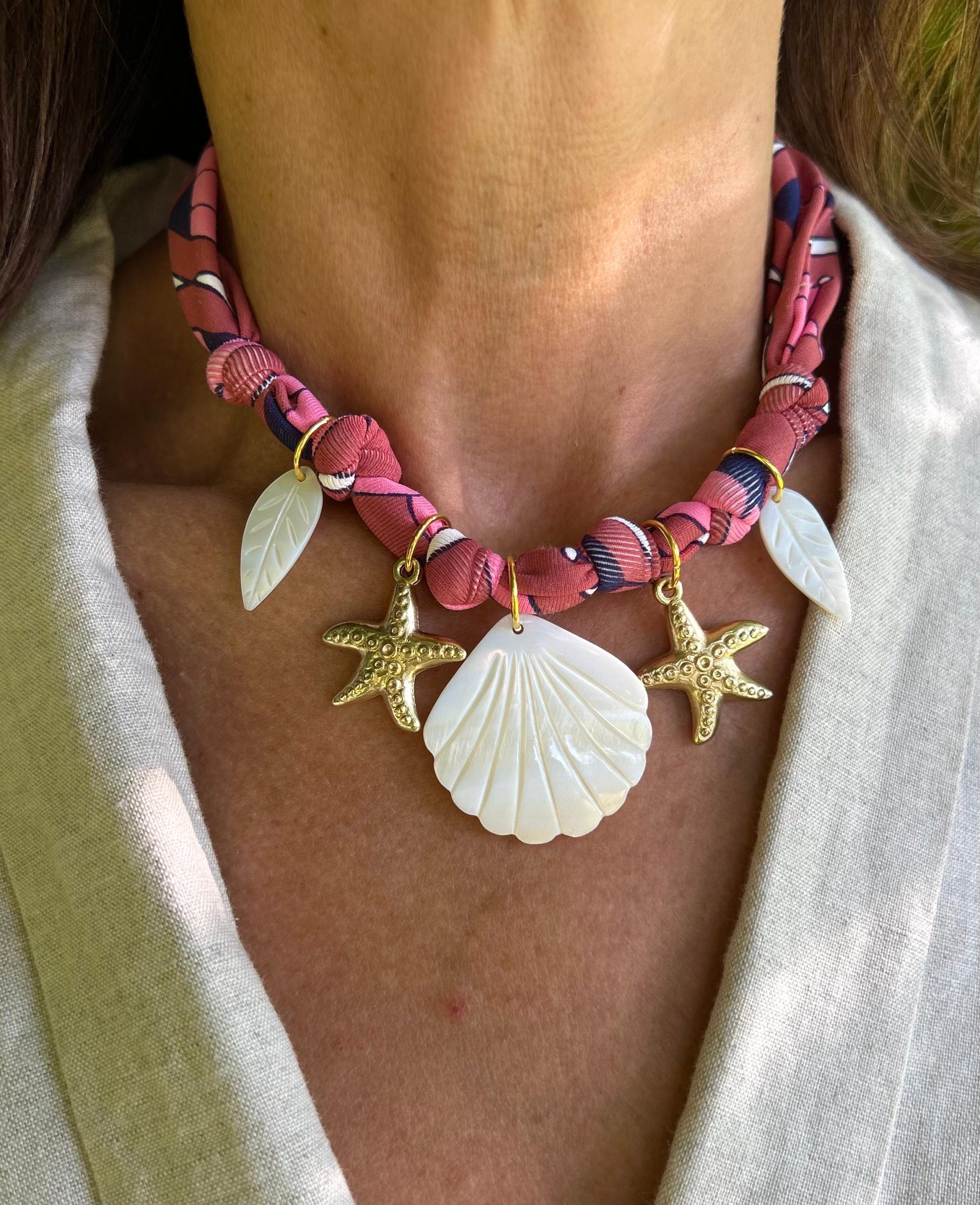 COLLAR TELA LYCRA, COLGANTES DE NACAR Y ACERO , MEDIDAS APROX. 75 CMS.