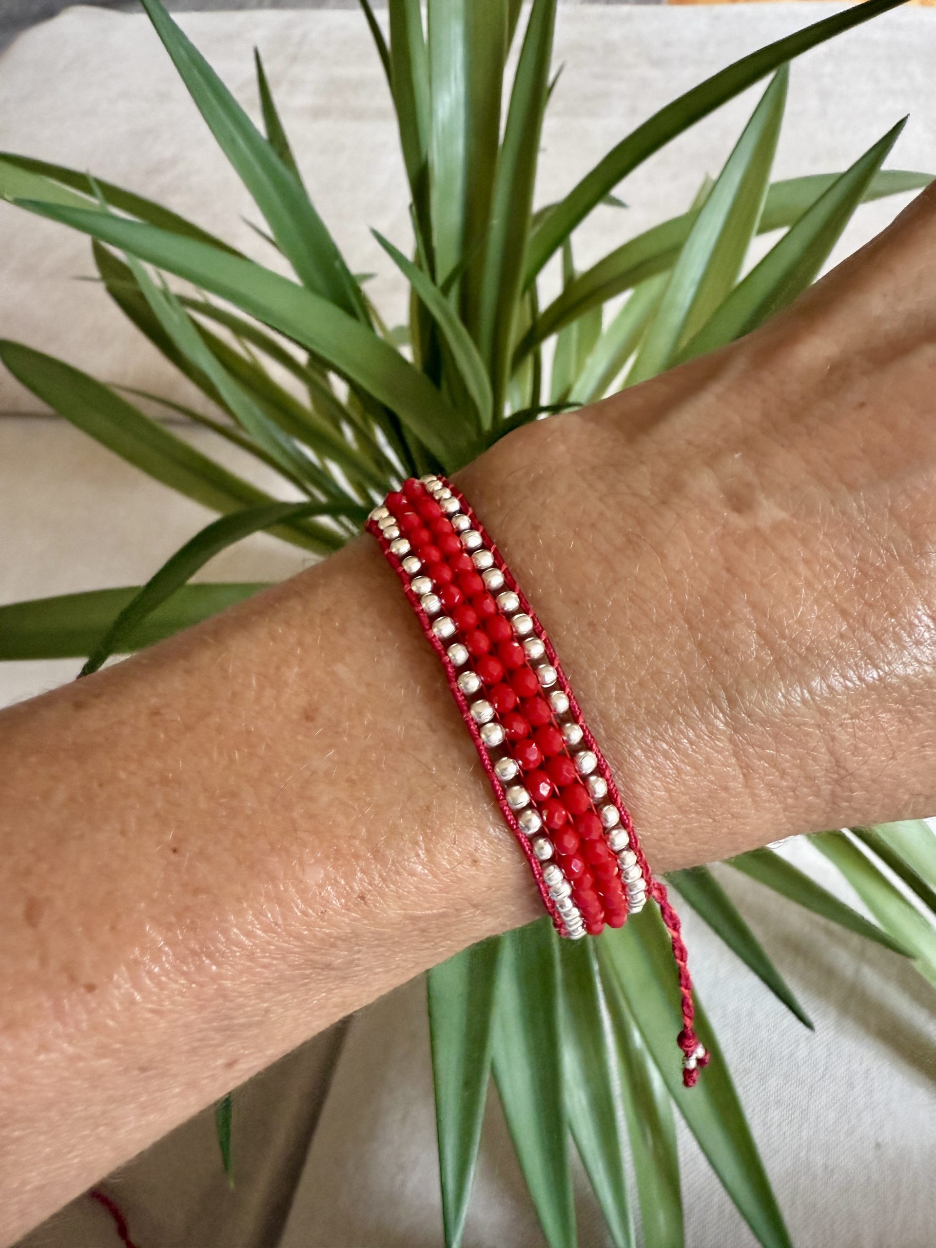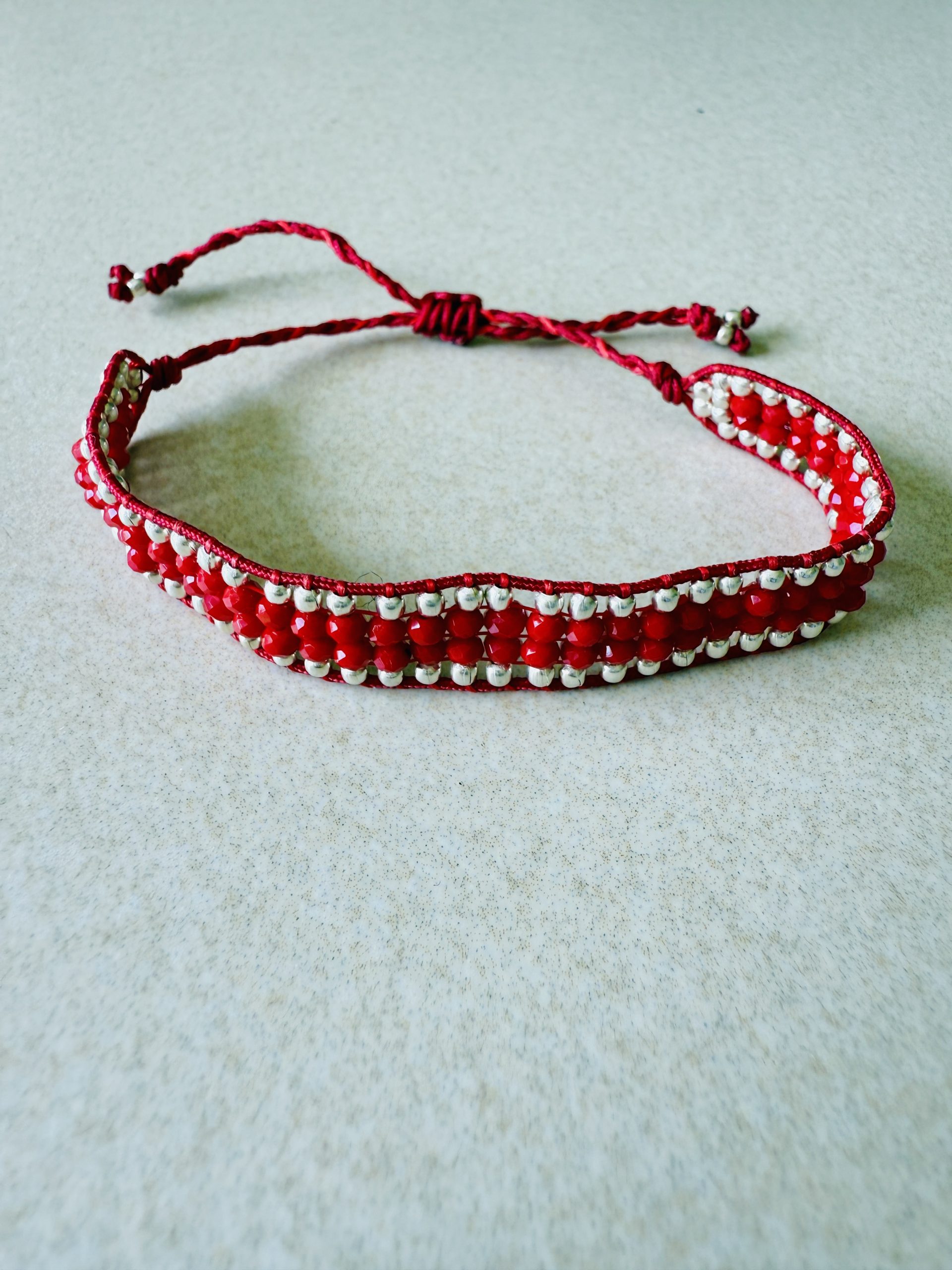 PULSERA TEJIDA A MANO, HILOS Y CRISTALES ,AJUSTABLE.